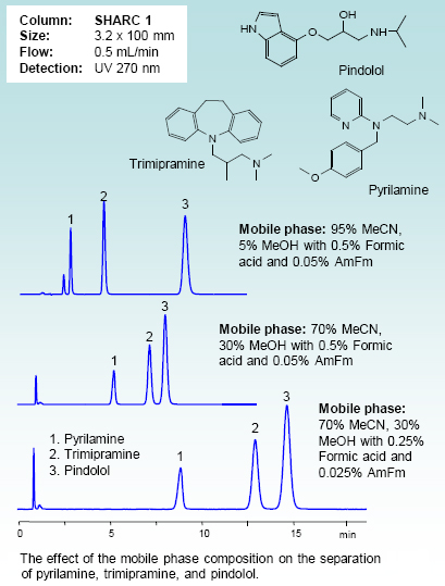 SHARC 1 is the first commercially available column whose primary separation mode is hydrogen bonding. The stationary phase is a hydrogen bond acceptor which interacts with electronegative atoms of analyte molecules. This unique column technology enables the separation of polar molecules of similar structure such as isomers and related impurities.