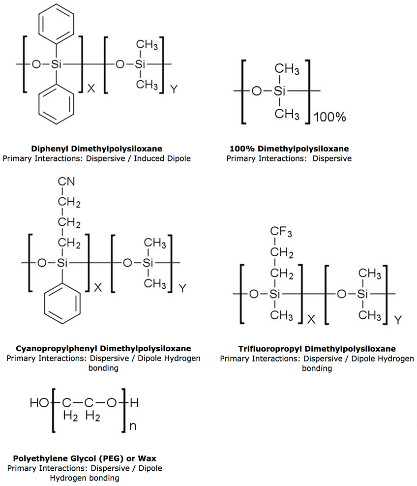 Figure 1: Most common stationary phase types in capillary GC with their primary interactions.