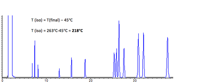 The Giddings approximation tells us that the optimum isothermal temperature is around 45oC below the elution temperature of the final peak within the chromatogram.