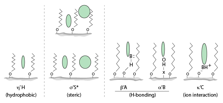 Figure 1: Cartoon representation of five solute–column interactions of the Hydrophobic Subtraction Model.