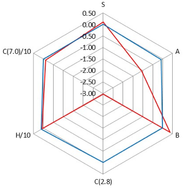 Figure 2 shows subtle differences (full scale of radar plot is 0.35 units) in Steric (S), Ion Exchange (silanol acidity) (C2.8) and Surface Acidity (A) between the two C18 phases. However very large differences (full scale of radar plot is 3.5 units) between Ion Exchange capacity, Surface Acidity and Surface Basicity (B) are highlighted between the C18 and Polar Embedded columns compared in Figure 3.