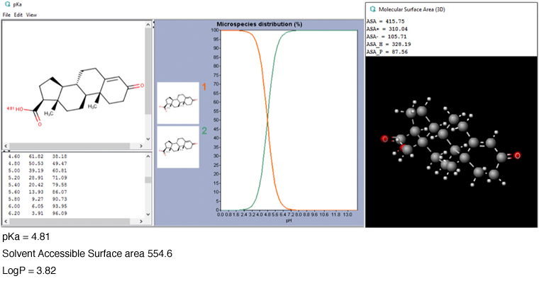 Figure 4: Some selected outputs from the calculation performed in MarvinSketch on the acid analogue of the Androstadienedione analyte.