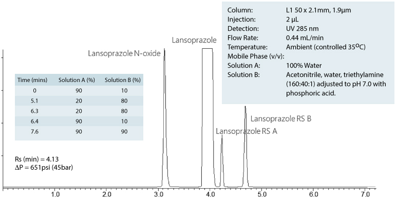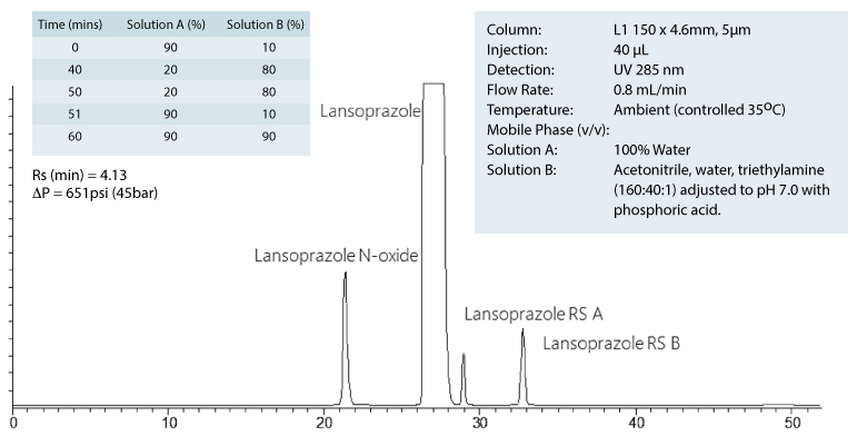 Starting with the proposed adjustments to the gradient profile, we can use the USP method for Lanzoprazole and it impurities, alongside an allowable change in column dimensions and flow rate to explore what an ‘adjusted’ method may look like.