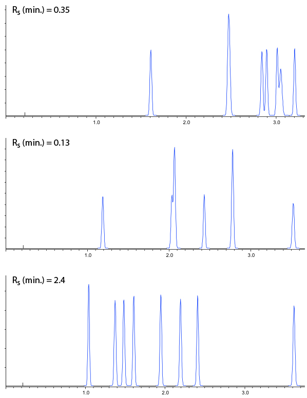 These chromatograms could then be assessed by eye, in combination with the efficiency, selectivity, peak shape and resolution values to assess which combination will be taken forward for optimisation, or if a different set of stationary phases or pH ranges may need to be employed.