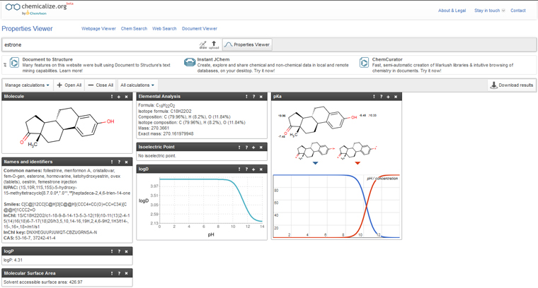 Figure 2: Screen shot of some of the information available from Chemicalize. (www.chemicalize.com)
