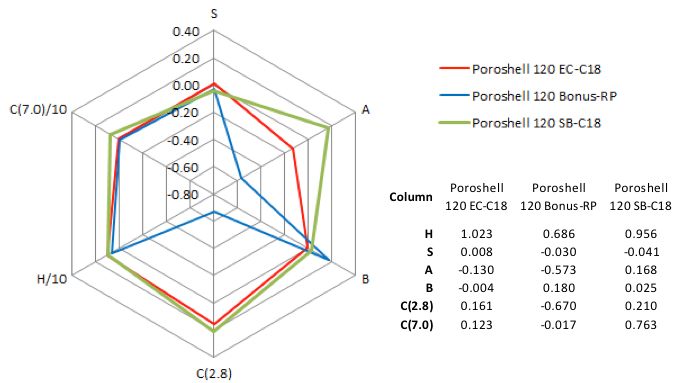 You will see that the database characterises the columns as per the parameters described in the hydrophobic subtraction model (HSM) [3]. This database is very useful for finding the HSM data on just about every reversed phase column in existence, as well as looking for similar, orthogonal column chemistries, and highlighting columns which have dominant characteristics for the retention and separation of target analytes.