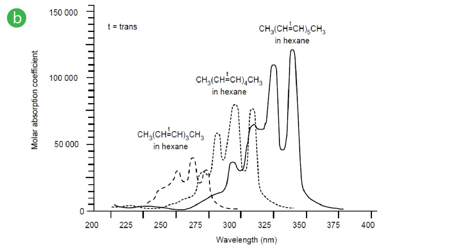 Electronic transitions involving ground state s electrons or non-bonding (n) electrons into their various antibonding orbitals usually require a large amount of energy and therefore typically occur in the 180-240nm region of the UV spectrum and are also of lower intensity compared to other transitions.  For this reason, compounds which do not contain p electron systems (double bonds) typically occur at lower wavelengths) higher energies and this can be quite problematic when choosing UV detection wavelengths as the solvents and additive we use, can often interfere with the analyte absorption, so lowering sensitivity and adding to the general background noise.  This being said, individual π-π* transitions involving just one double bond may also require higher energies and therefore may occur at lower wavelengths (e.g. ethene has a λmax of 175nm).  Shifts of the λmax to higher wavelengths, which are less susceptible to interference from solvents or additives, typically only occur when the system is conjugated with multiple double bonds or are combined with other chromophores such as atoms containing lone pairs (n electrons) which are capable of electronic excitation (Figure 4).
