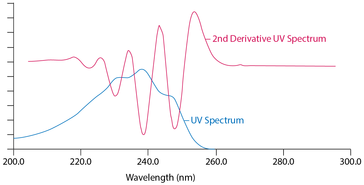 Most UV detector or CDS software can create ‘derivative’ spectra (dA/dλ) and these spectra contain increasing greater numbers of useable maxima and minima which add data points to the spectra which can be very useful for increasing confidence when identifying or tracking peaks (Figure 8).