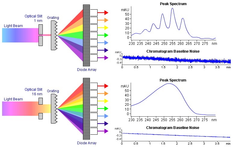 Spectral Bandwidth or Resolution settings need to be balanced between qualitative and quantitative requirements.  Because the bandwidth parameter effectively ‘averages’ response over a fewer or greater number of diodes,  larger bandwidths result in better signal to noise ratio as the noise falls off more quickly than the signal.  However this ‘averaging’ also results in the loss of spectral features as is explained in Figure 6.