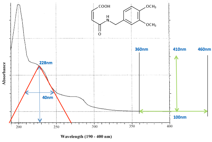 I always chose a 'maxima' within the analyte UV spectrum, to give a good compromise between sensitivity, whilst keeping the acquisition wavelength well above 200 nm, to avoid absorbance effects from the organic solvents and additives we use in UV detection (yes – it's not just the organic solvent which absorbs!!). In the example shown below using the maleic anhydride veratrylamine derivative (MAVA), I chose 228 nm. There are arguments about choosing the peak maximum and robustness – however I figure if you have a reasonable bandwidth setting and your instrument is half decent, there shouldn't be any issues with wavelength 'drift' causing irreproducible absorbance between analyses or even over a long campaign of samples.