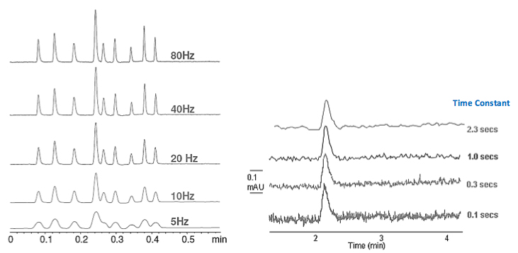 Although debate rages, I've always found that 20-25 samples (measurements) across the peak has given rise to good quantitative reproducibility and peak shape modelling (sensitivity). However, we can also be OTT with respect to data sampling and high sampling rates and fast response times (Time Constants) can give rise to some very noisy baselines – which can become problematical when measuring smaller peaks in the presence of larger ones (trace analysis). Whilst high data sampling rates are to be encouraged, we should be mindful that we may need to alter the time constant in order to electrically filter out some of the associated noise. These principles are outline in Figure 4.