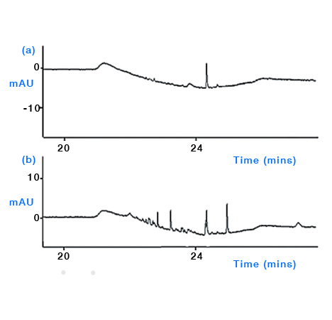 Figure 5: Comparison of the effect of wearing different laboratory glove types when preparing aqueous mobile phase for HPLC. Comparison of baseline profiles (254 nm) obtained following enrichment of 60 mL aqueous mobile phase onto a HPLC column prior to elution with acetonitrile gradient. (a) aqueous mobile phase prepared wearing pre-washed thicker reusable nitrile glove and (b) aqueous mobile phase prepared using thin disposable nitrile gloves showing elevated level and number of contaminant peaks arising from handling the mobile phase inlet line. (Reproduced from reference 2)
