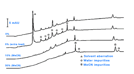 Organic solvents – there is a host of literature on the quality of organic solvents used for HPLC, but almost without exception the rule is to buy the best quality solvents and run some test gradients to assess the true purity of the solvent under the gradient conditions employed in your laboratory. Solvent quality becomes of particular importance when performing trace analysis and/or when using lower UV wavelengths for detection and several stidies have shown the possibility of trace contamination from laboratory grade solvents [5, 6]. Of course, the large scale production of ultra-pure solvents is not a straightforward process and one should not discount the solvent from any investigation into the origin of ghost peaks. Whilst many methods for the further purification of solvents have been investigated [7], the use of adsorbents to remove impurities is typically unsuccessful due to the strongly eluting nature of the organic solvent. One might assess the level and origin of solvent contamination by injecting increasingly large amounts of water to assess the effects or equilibrating with increasingly higher amounts of organic solvent (i.e. increasing the amount of organic at the start of the gradient [6] (Figure 6).