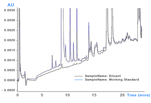 Figure 7: Top – pharmaceutical impurities method (blue chromatogram) and blank injection showing significant contribution from contaminant peaks. Bottom – the same analysis after cleaning and flushing of the autosampler injection valve. Mobile phase: A – 20mM ammonium acetate buffer B: acetonitrile. Timetable (mins, %B) (0,5), (21,55), (24,95), (25,5)
