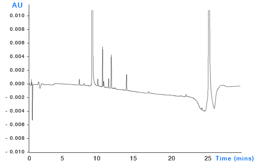 Water used for HPLC – whilst typically pure when used from Winchester bottles (HPLC Grade), there is a distinct possibility that the water from deionising / purification units may contain bacteria if not properly cleaned and serviced. Bacteria produce waste and decompose to give a host of UV active compounds which can give rise to ghost peaks in gradient analysis (Figure 3). Ensure that all water production units are well maintained and that bottles used for eluent reservoirs, seal wash and needle wash are regularly cleaned. Avoid using surfactant based detergents (or any detergents at all!) as these may also give rise to ghost peaks if not properly rinsed (Figure 4). To reduce microbial growth, use at least 15% methanol or 5% acetonitrile in aqueous mobile phases which need to be stored for any length of time and keep eluents in the fridge if they need to be stored. Be sure to regularly clean the sinkers / filters which are placed in the eluent reservoirs as these are known to harbour bacteria (do not sonicate ceramic / glass filters). Consider the use of polystyrene divinyl benzene filters to filter the aqueous eluent portion if problems persist, although the possibility of leaching from the filter / filter housing should be evaluated.