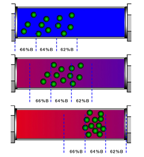 Further, as the eluotropic strength of the eluent system increases during the gradient and analyte bands begin to migrate through the stationary phase bed, the elution strength at the ‘font’ of the band (nearest the detector) will always be slightly weaker than that at the ‘back’ of the band (nearest the injector) as by definition the stronger eluent enters through the column inlet, displacing the weaker eluent from the column. This causes a further 'focussing' process whereby the analyte band is compressed as the rear part of the band moves more quickly than the front (Figure 2). This is one of predominant factors in determining analyte peak width in gradient analysis and why, ultimately, all peaks within a gradient analysis have approximately the same peak width.