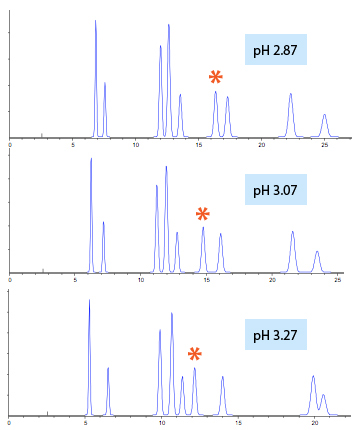 In our method, a large change in selectivity / resolution was induced by a very small change in pH and this is indicates that pH control using a pH meter to monitor pH whilst dripping in a dilute solution of formic acid into constantly stirred solution, may not be sufficiently accurate. Actually the issue in this case was found to be that the operator had not measured the final pH of the solution on standing (i.e. with no stirring). In such circumstances, it may be better to produce the eluent either volumetrically or gravimetrically which will produce a more accurately controlled pH.