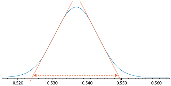 In Figure 1 the chromatographic peak volume can be estimated by drawing tangents as shown to estimate 4σ peak width – in this case the peak width is 0.5495 – 0.5240 mins = 0.0255 mins and the flow rate was 600 μL per minute giving an estimated peak volume of 15.3 μL. This would dictate that the total system extra column volume (ECV) should be less than 8 μL (approx.) in order to achieve the optimum resolving power of the column / system combination.