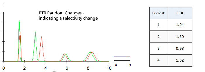 c) No Trend (Random changes in RTR value) – selectivity change indicating pH / solvent or stationary phase issues (changes)