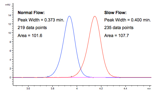 As flow rate slows the analyte moves through the flow cell more slowly, more data points are collected and the peak area increases.