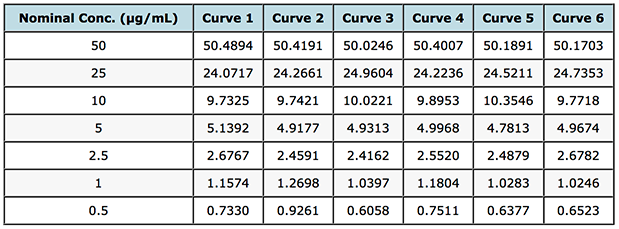 So fortunately, I had access to the gemfibrozil assay validation data and 6 replicate standard curves which were generated in order to assess various validation criteria and their back calculated values from the regression lines derived for each separate cure and these are shown in Table 1. We can use these data to get a better measure or picture of the homo- or heteroscedasticity of the data. Whilst I appreciate that one might not go these lengths when simply building a calibration curve using a previously validated assay – non-random residuals in a simple unweighted linear calibration do point towards a lack of attention to the proper calibration model during method development and validation.