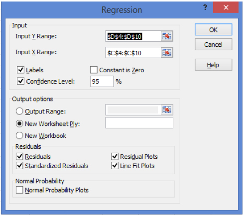 Figure 2: Requirements for the Regression Options form (note: include the title of each data set in the Input Ranges).