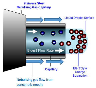 - The HPLC eluent flows into a capillary nebuliser (sprayer) which is held under high potential difference, causing ions of opposite charge to be attracted towards the walls of the capillary and those of like charge to remain within the eluent flow. The charge on the capillary is selected to match the charge on analytes of interest, or to rapidly switch between positive and negative modes.