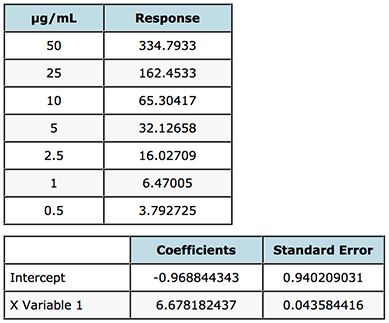 An F-test can be easily carried out in MS Excel (F-Test Two-Sample for Variances) and works on the basis that if the F statistic value in the output is greater than the One-tail Critical F factor (take from tables or from the Excel output) then we need to reject the null hypothesis and state that the variances at the high and low end of the curve are unequal and that some form of weighting will produce more valid answers. The results of this test, performed on the instrument response rather than the interpolated values, are shown in Figure 3. As the F-test compares the variances of two samples (or populations if one has large amounts of data), it is typical to compare the data from the highest and lowest concentrations on the calibration curve. One needs at least two determinations at each concentration, although to increase the validity of the test – one should aim to have at least six replicates.