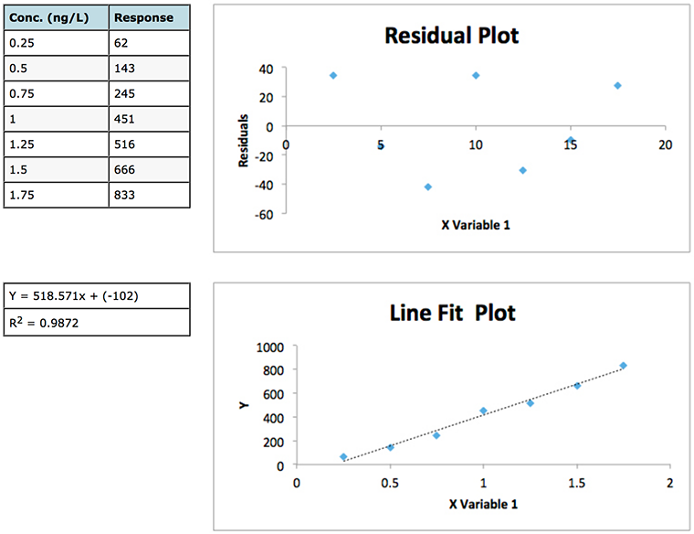 By combining all responses and concentrations into two contiguous columns with MS Excel and re-running the regression statistics described above we can get a fuller picture of the residuals spread for this particular analysis. The residuals plot shown in Figure 2 displays this data.