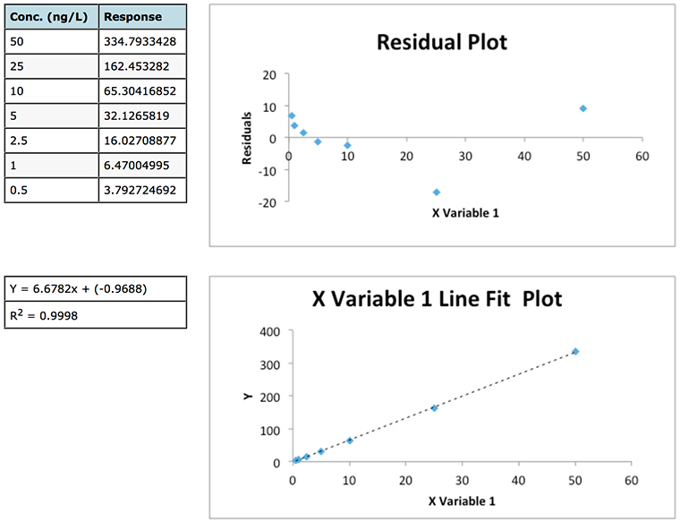 I’ve written about error estimation from the calibration curve and many others have written similar articles, however I continue to see mistakes being made in some of the crucial decisions associated with calibration curves, in particular with the treatment of the origin, weighting of the regression line, rejection of outliers and estimation of the ‘goodness of fit’ where we typically and often incorrectly rely upon the coefficient of determination (R2) to accept or reject the calibration function.