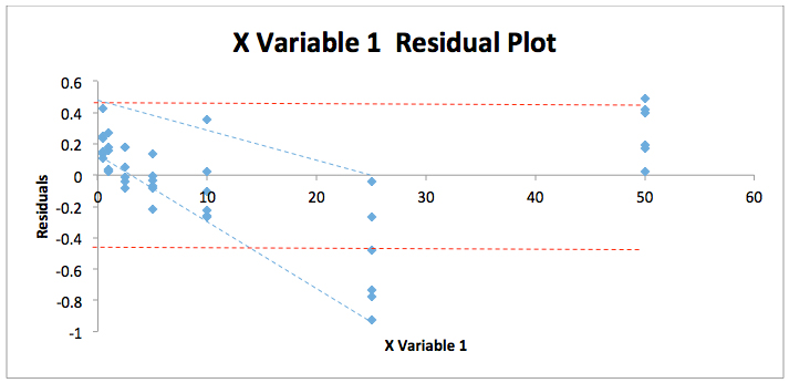 As can be seen the error in the data seems to form a ‘fan’ shape (blue dotted lines) which suggests that the variability in the data at low concentrations is lower than that at high concentrations rather than being equally and randomly distributed with equal variance – for instance between the two red dotted lines on the figure. However, it is difficult to be absolutely sure due to the distribution of the residuals – which we pointed out much earlier in the discussion, seems to take a U-shape. To test for heteroscedasticity and we can employ an F-test to test if this assumption is correct.