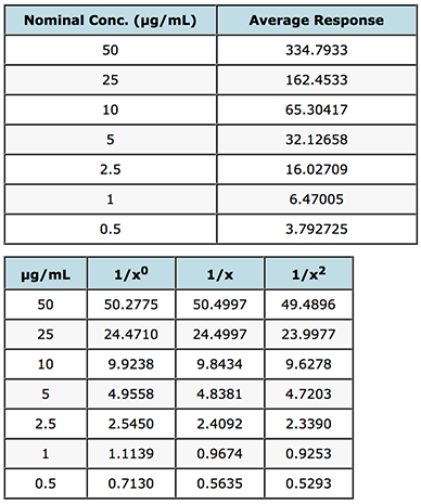 The value of S%RE is the sum of the relative errors and gives a good indication of the most appropriate weighting to use on the data. In this case of weighting of 1/x2 will result in the smallest errors in the interpolated values of unknowns across the whole calibration range. If we refer back to the FDA guidelines mentioned above – it calls for the ‘simplest model’ to be used (1/x0 in preference to 1/x and then 1/x2 etc.) to ensure the data meets criteria on maximum allowable error – and of course we should examine the data carefully to see which of the weightings would fall into this category by referring to the allowable error in the particular guidelines chosen.