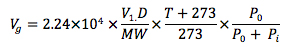 V1 = injection volume (µl), D = sample solvent density (g/mL), MW = molecular weight of sample solvent, T = inlet temperature (oC), Pi = inlet pressure, Po = atmospheric pressure