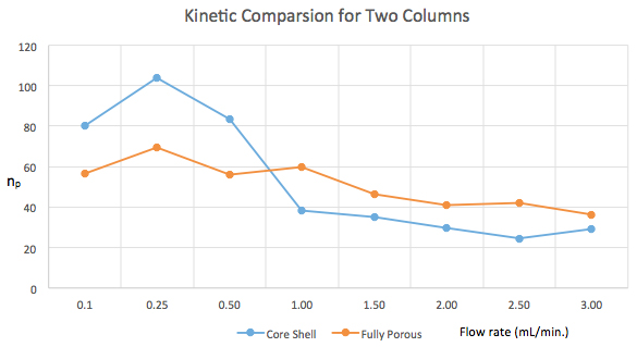 It should be pretty obvious from the peak capacity values on the y-axis that the different columns are best at different flow rates and that the best performance comes from the core shell column at flow rates of 0.25 and 0.5 mL/min.  At this flow rate with this column the number of peaks which can be separated in unit time is highest.  This is a conundrum as the methods needs to be as fast as possible.