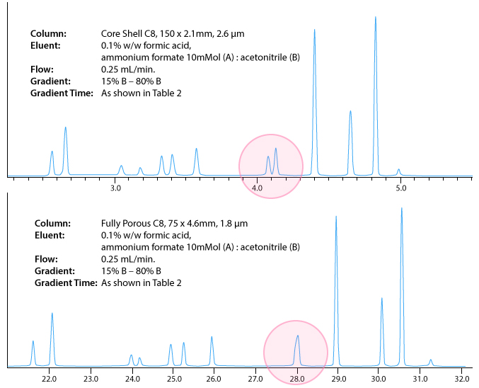 The phase on both columns was purported to be the same by the manufacturer (although I’m always a little skeptical regarding the portability of selectivity when changing particle morphology).  I have a UHPLC system connected to the mass spectrometer and therefore the possibilities for flow and pressure are pretty wide ranging and the extra column volumes are low.