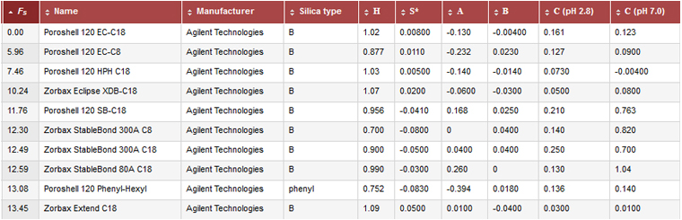 You will see that the database characterises the columns as per the parameters described in the hydrophobic subtraction model (HSM) [3]. This database is very useful for finding the HSM data on just about every reversed phase column in existence, as well as looking for similar, orthogonal column chemistries, and highlighting columns which have dominant characteristics for the retention and separation of target analytes.