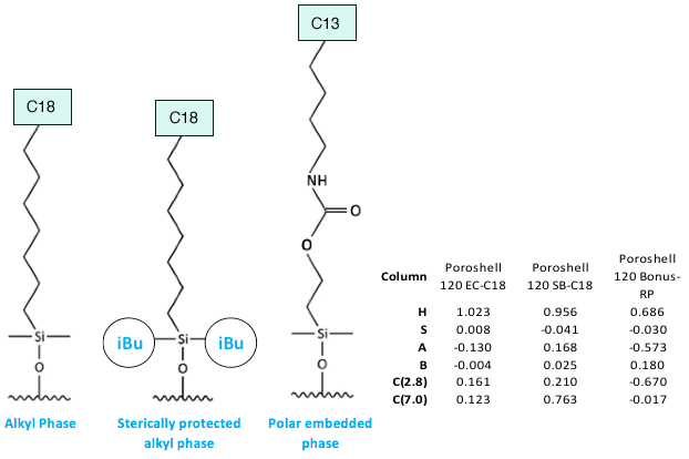 Figure 6 indicates that the polar embedded bonus RP column will show much greater retention of acidic species due to interaction with the embedded basic group in the ligand, and much lower retention of basic species, as any exposed surface silanol groups are ‘shielded’ by the embedded polar ligand. In general the hydrophobic retention of this column is lower, so any less polar compounds should show shortened retention times.