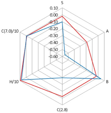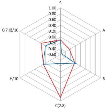 Figure 2 shows subtle differences (full scale of radar plot is 0.35 units) in Steric (S), Ion Exchange (silanol acidity) (C2.8) and Surface Acidity (A) between the two C18 phases. However very large differences (full scale of radar plot is 3.5 units) between Ion Exchange capacity, Surface Acidity and Surface Basicity (B) are highlighted between the C18 and Polar Embedded columns compared in Figure 3.