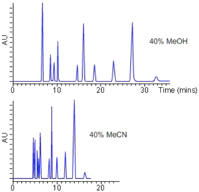 The relative acidity and basicity of each modifier has different effects on the solubility of the analyte in the mobile phase relative to the stationary phase and hence selectivity between analytes. For this reason, a screen to investigate the selectivity ‘map’ for any separation should include chromatograms generated using both acetonitrile and methanol.