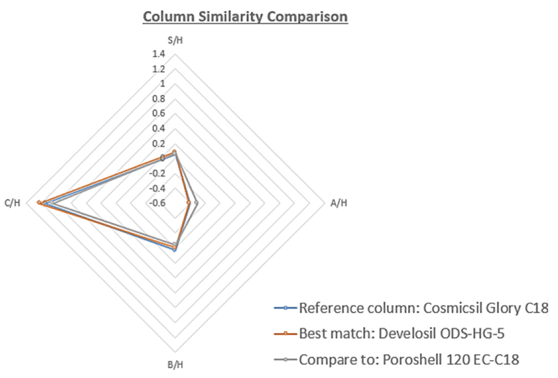 Perhaps this is the ideal time to place more focus on the selectivity databases which exist, which can help to demonstrate the ‘equivalence’ of selectivity of two different phases. At Amalgamated Laboratory Solutions, we use a model based on the PQRI selectivity database (Hydrophobic Subtraction Model, HSM [1]), alongside some other key metrics to help clients understand the equivalence of reversed phase HPLC stationary phases. Alongside the HSM model we use a linear regression model for measuring the equivalence of each selectivity characteristic [2,3] and other checks to demonstrate the theoretical equivalence of columns and have found success with this model – some examples of reports and graphical comparisons are shown below for reference.