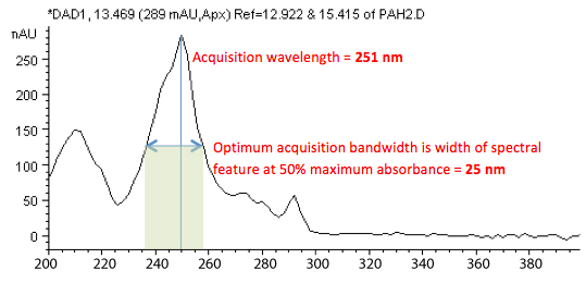 From Figure 4 we can see that the acquisition wavelength is typically chosen to coincide with the maximum absorption from the UV spectrum. The bandwidth is set according to the width of the spectral feature at 50% of the maximum absorbance as shown.