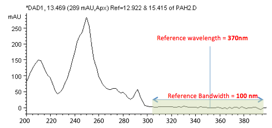 Reference bandwidth is an arbitrary choice depending upon noise obtained but is typically 100 nm, to give minimal baseline drift due to changes in Refractive Index as the eluent composition changes, as well as minimum noise. Figure 5b demonstrates the effects of changing reference bandwidth on a typical HPLC separation.
