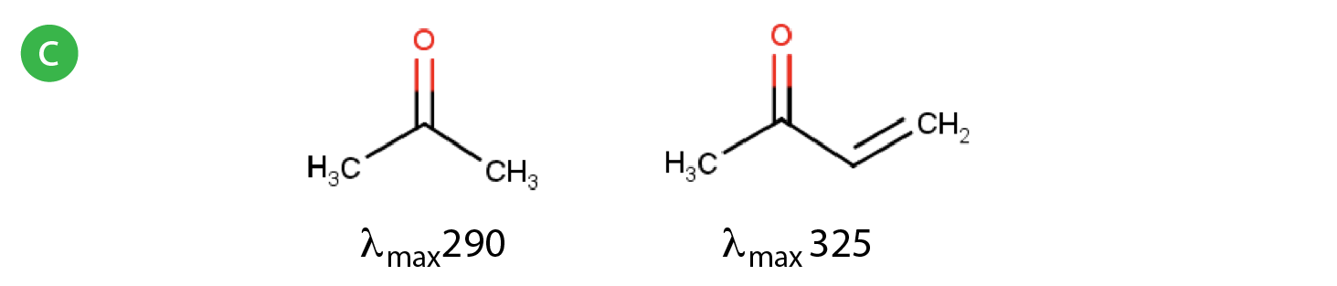 Electronic transitions involving ground state s electrons or non-bonding (n) electrons into their various antibonding orbitals usually require a large amount of energy and therefore typically occur in the 180-240nm region of the UV spectrum and are also of lower intensity compared to other transitions.  For this reason, compounds which do not contain p electron systems (double bonds) typically occur at lower wavelengths) higher energies and this can be quite problematic when choosing UV detection wavelengths as the solvents and additive we use, can often interfere with the analyte absorption, so lowering sensitivity and adding to the general background noise.  This being said, individual π-π* transitions involving just one double bond may also require higher energies and therefore may occur at lower wavelengths (e.g. ethene has a λmax of 175nm).  Shifts of the λmax to higher wavelengths, which are less susceptible to interference from solvents or additives, typically only occur when the system is conjugated with multiple double bonds or are combined with other chromophores such as atoms containing lone pairs (n electrons) which are capable of electronic excitation (Figure 4).