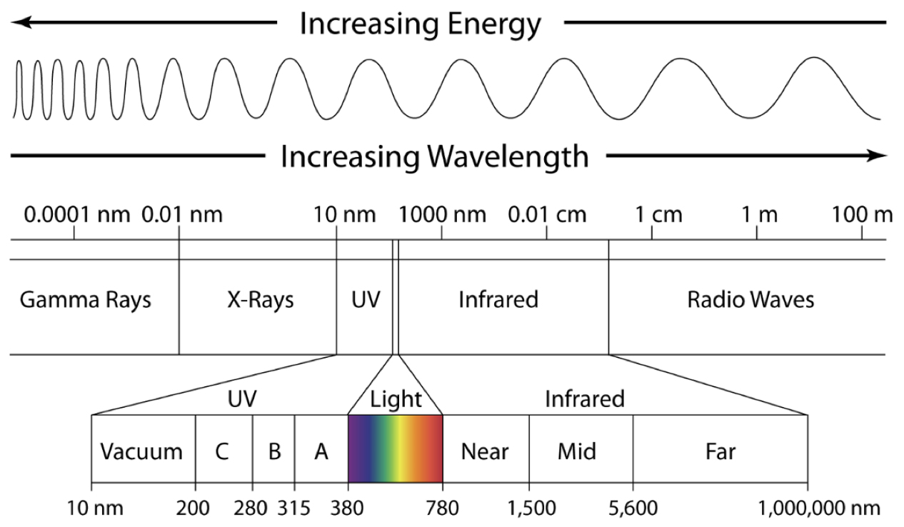 Figure 1:  The electromagnetic spectrum and the relationship between wavelength and photon energy.