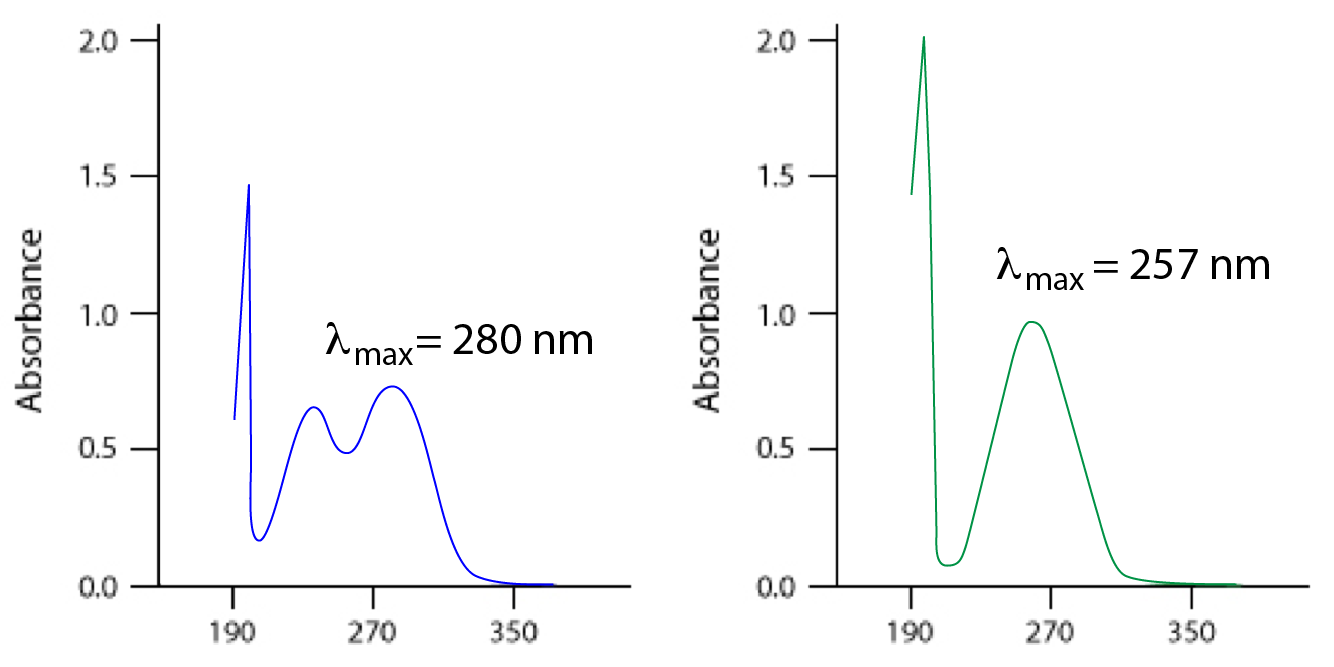 Carbonyl groups in particular can hydrogen-bond to solvents, which can accentuate the change to the UV spectrum when measured in polar solvents.  For example, changing from hexane to water as the solvent for propanone changes the absorption maximum from 280 to 257 nm (Figure 5).