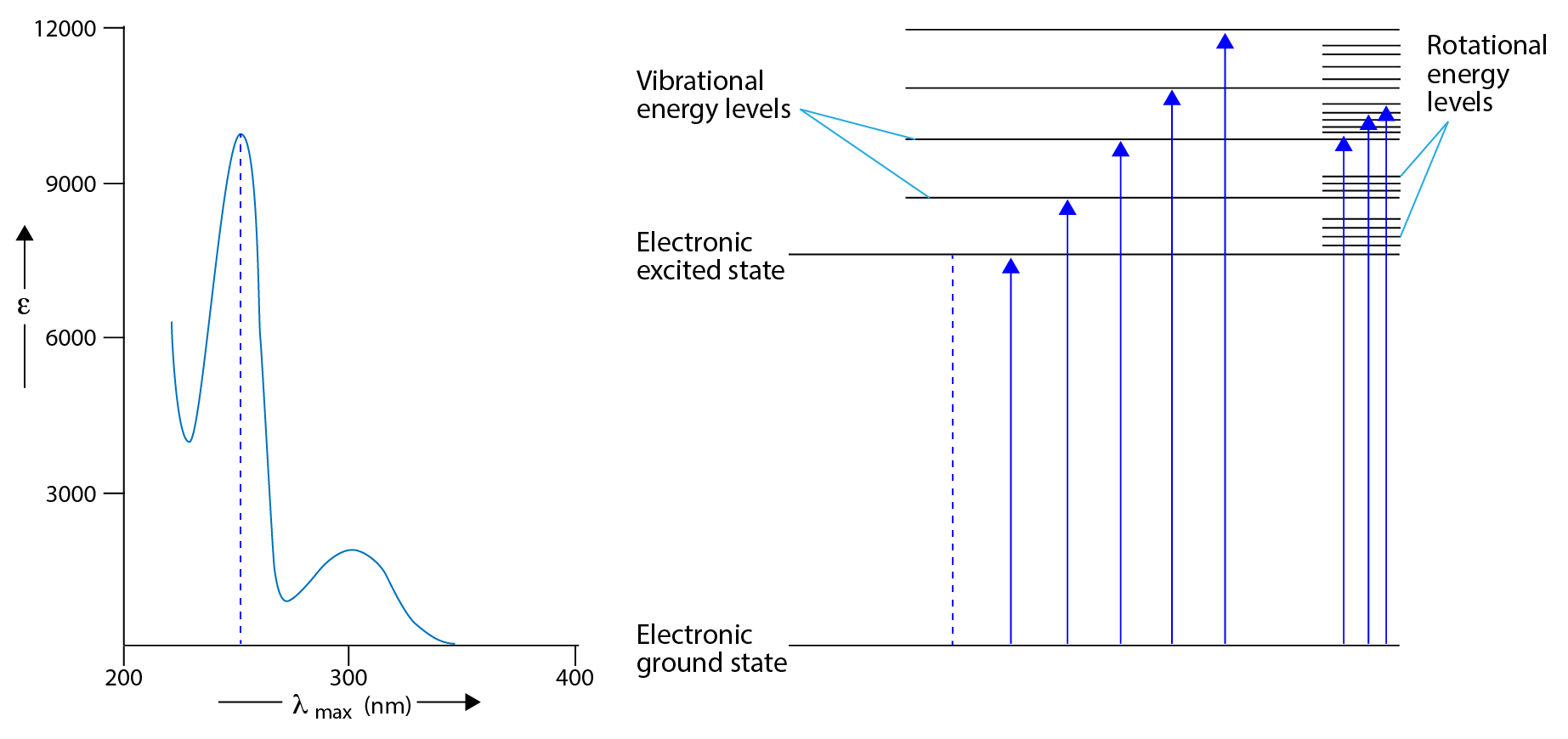 Figure 3:  Relationship between nominal electronic transition and various vibrational and rotational sub-levels which lead to broader spectra than expected in UV spectroscopy.