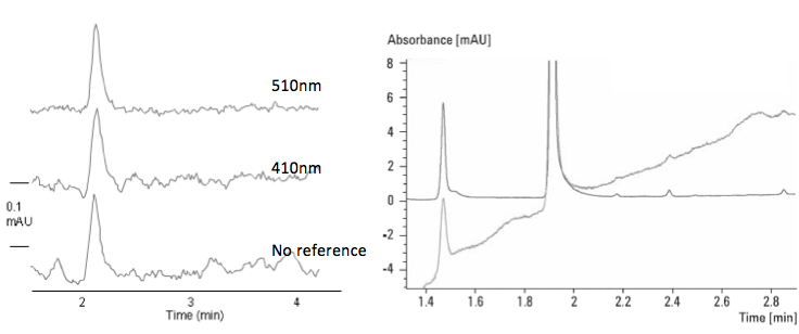 Some manufacturers offer the opportunity to set a reference wavelength. The reference wavelength compensates for fluctuations in lamp intensity as well as changes in the absorbance/refractive index of the background (i.e. mobile phase) during gradient elution. During gradient elution the composition of the eluent will change, as will its refractive index, which will affect absorbance as the Beer Lambert Law in only linear when constant refractive index is assumed. To compensate for the change in refractive index properties a reference wavelength can be set to avoid baseline drift (Figure 7). Noise will also be reduced as the reference wavelength is moved closer to the sample signal. Without any reference measurement all noise and variability in lamp intensity is recorded within the signal. When using a reference signal all lamp intensity and background (mobile phase) variability is subtracted out of the signal being measured. The closer the reference wavelength is to the sample wavelength the more effectively these background deviations are catered for and the better the detector sensitivity. However, the reference wavelength should not be selected too close to the analyte wavelength or the signal intensity may be seriously reduced.