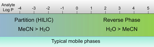 It is generally accepted that the organic eluent content in HILIC mode is 70% or greater. The most popular weak solvent is acetonitrile, due to its aprotic (intermediate polarity, lacking an acidic proton) characteristic which encourages retention of polar analytes. Other ‘weak’ solvents may be used in HILIC mode and the general solvent strength series for HILIC separations is: