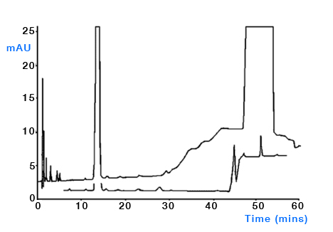Figure 4: Baseline profiles arising from different sources of mobile phase contamination. Comparison of baseline profiles (254 nm) obtained following enrichment of 60- mL aqueous mobile phase onto a HPLC column prior to elution with acetonitrile gradient. Top: stock aqueous mobile phase showing peaks from enriched trace contaminants (maximum contaminant peakheight (HCmax) = 1 mAU). Bottom: dishwasher detergent (25 μL/L, HCmax = 39 mAU) (Reproduced from reference 2)