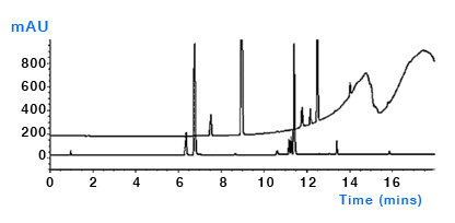 Figure 8: After standing for several hours the first injection of a sequence using a perfluorinated column (upper trace) and a C18 column (lower trace). Subsequent injections of the perfluorinated column showed less bleed. Columns: 150mm×4.6mm, 3μm, temp.40oC, 1.5mL/min, λ=254nm. EluentA: water plus 0.1% formic acid; eluentB: methanol plus 0.1% formic acid. Timetable(mins,%B):(0,10),(15,95),(18,95),(18.1,10),(23,10). (Reproduced from reference 1)